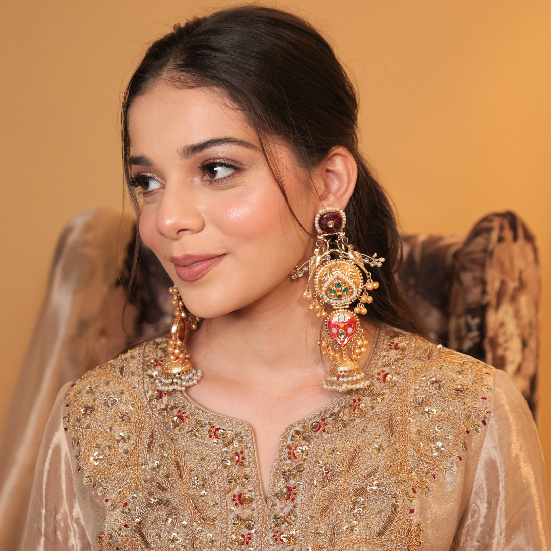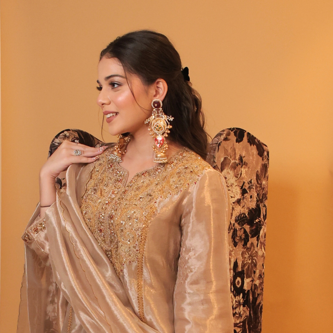 THIS SALWAR SUIT IS A PERFECT MIX OF CLASSIC AND TRADITIONAL. THE BEIGE GOLDEN COLOUR COMBINATION IS A DELIGHT FOR THE EYES. IT FEATURES OUR INTRICATE GARMENT CONSTRUCTION AND IS FURTHERED ENGINEERED WITH DETAILED ZARDOSI SEQUIN WORK.